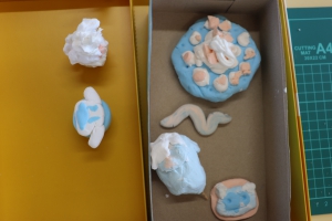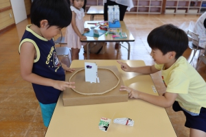 牛乳パックを使って、こまづくり、とんとんずもう、紙トンボなど