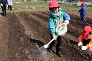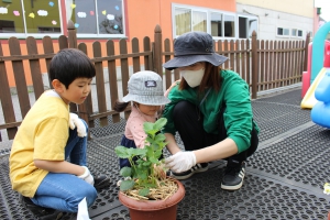 「いちご♫いちご♪♫」と口ずさみながら、スコップで土を混ぜたり