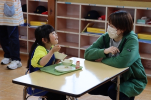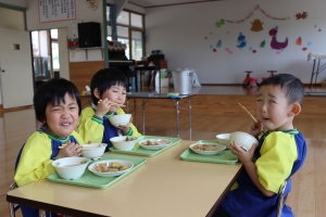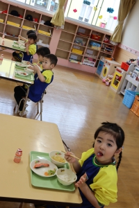 お昼ご飯を食べました。「お給食おいしいね~」と
