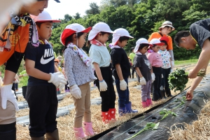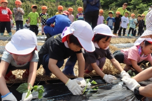 藁をかぶせたり、親子で上手にいちごを植えました。
