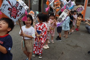 自分で描いたねぶたを持って、「やってまーれ、やってまーれ」
